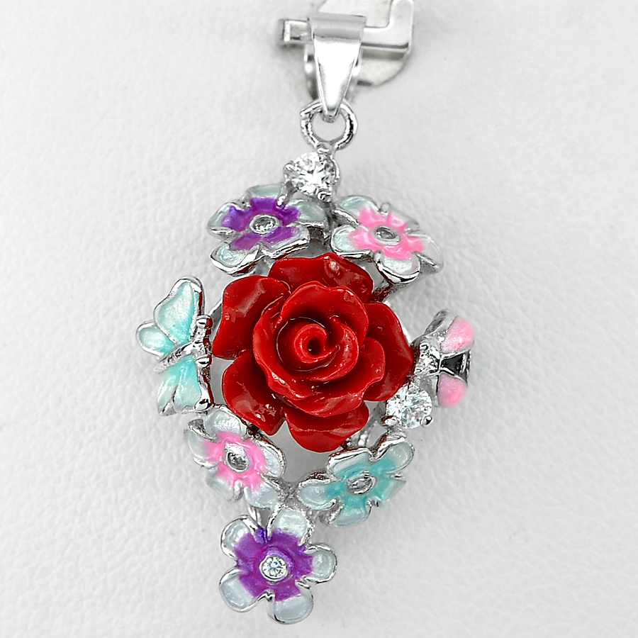 3.46 G. Real 925 Sterling Silver Pendant Red Flower Resin Multi-Color Enamel