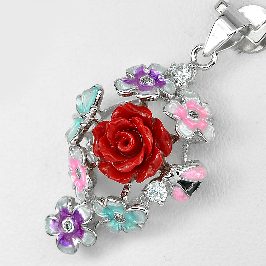 Good 3.19 G. Red Flower Resin and Flower Enamel Real 925 Sterling Silver Pendant
