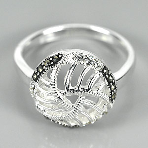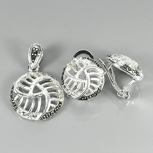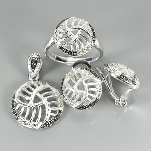 Silver Jewelry Sets 13.04 G. Black Marcassite Ring Pendant Earrings