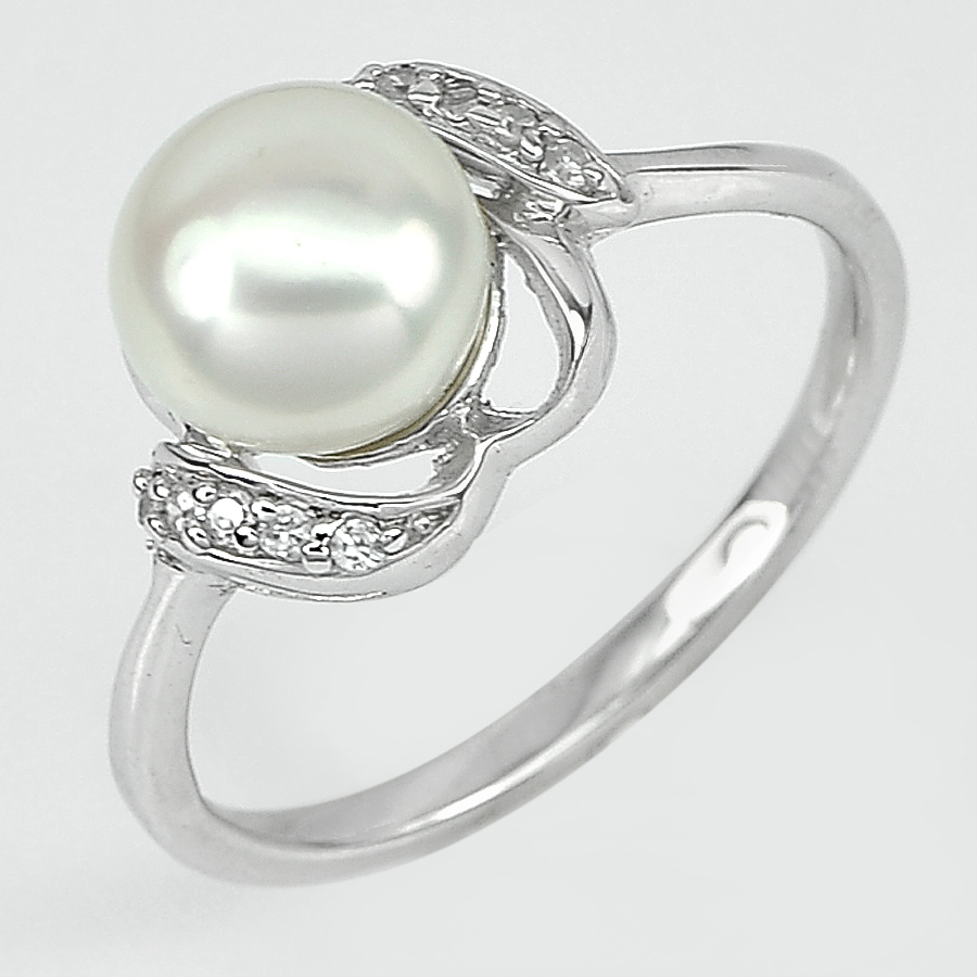 3.37 G. Natural White Pearl with White CZ Real 925 Sterling Silver Ring Size 8