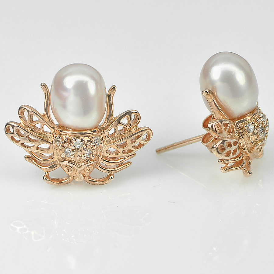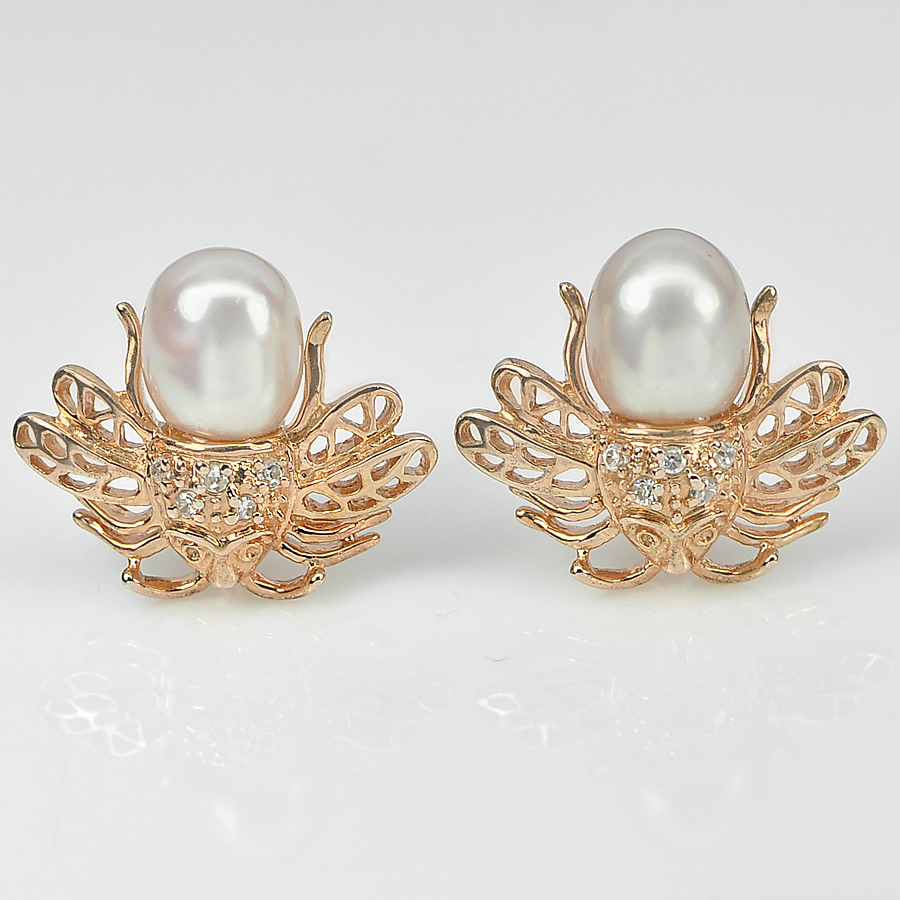 925 Sterling Silver Rose Gold Plated Earrings 5.05 G. Natural Gem Pink Pearl
