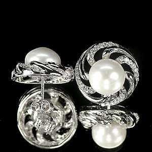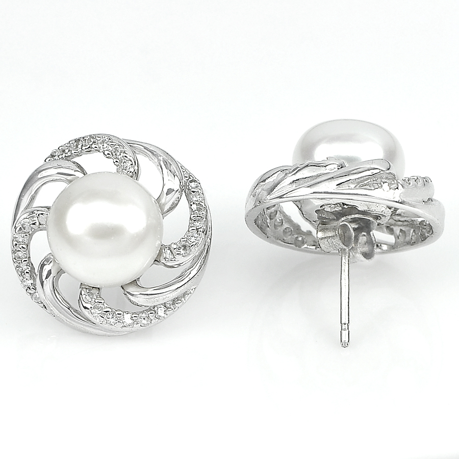 Center: 8.6 x 8.6, 9.2 x 9.2 Mm. Round Cabochon Natural White Pearl And 1 x 1 Mm. Round White CZ Many. Earring Size 18.9 x 16.4 Mm.