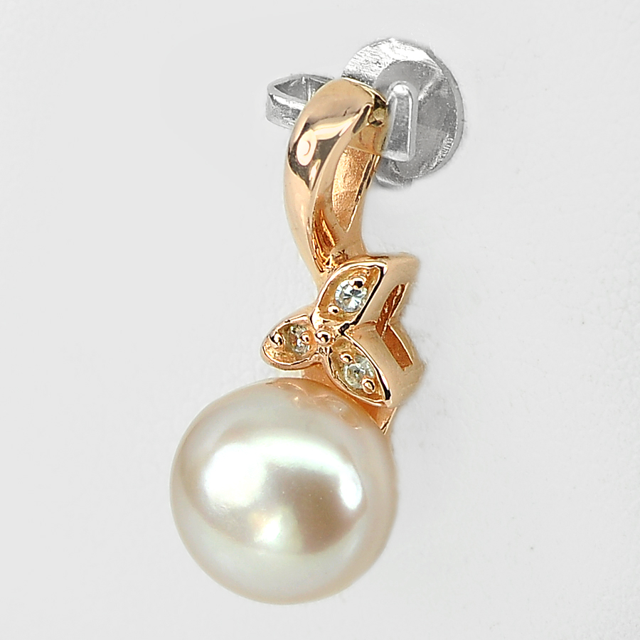 Center: Round Cabochon Natural Orangish Pink Pearl And Round White Cz , Pendent