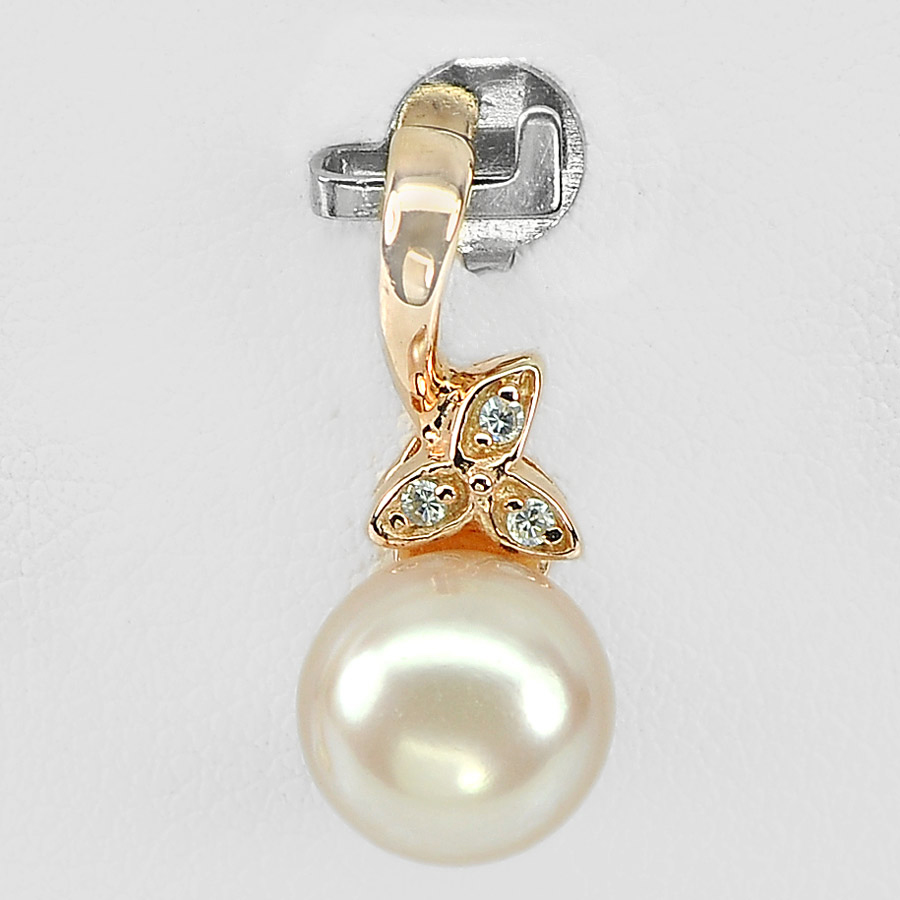 Center: Round Cabochon Natural Orangish Pink Pearl And Round White Cz , Pendent