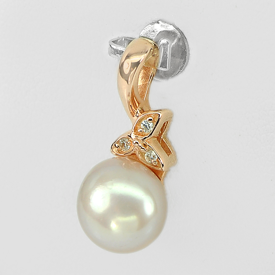 Center: Round Cabochon Natural Orangish Pink Pearl And Round White Cz , Pendent