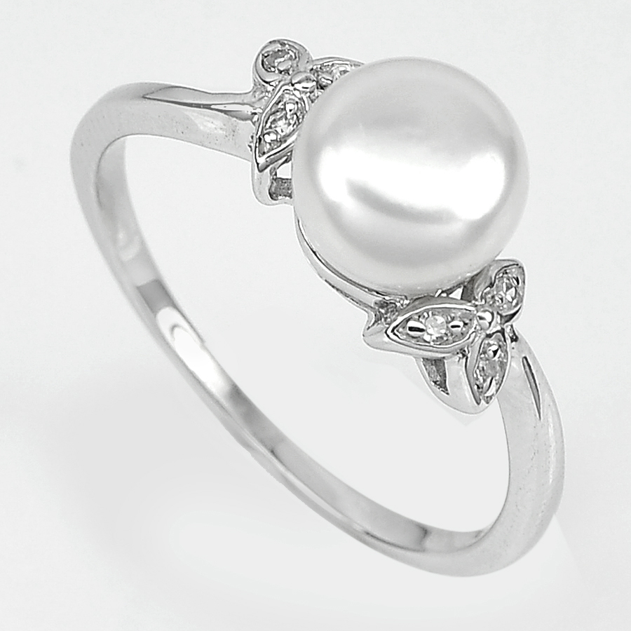 3.08 G. Round Cabochon Natural White Pearl 925 Sterling Silver Ring Size 10