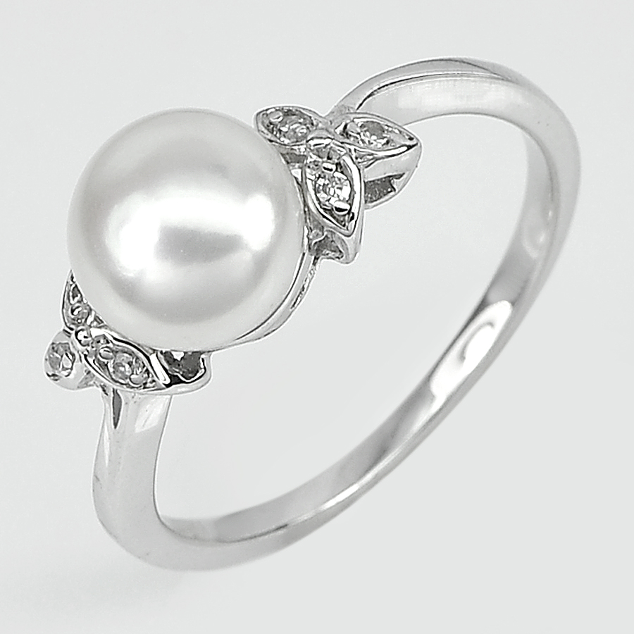 3.15 G. Round Cabochon Natural White Pearl Jewelry Sterling Silver Ring Size 9
