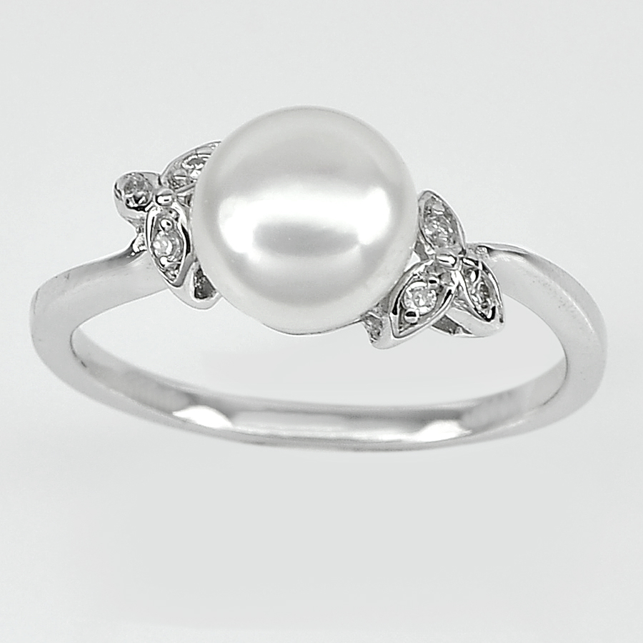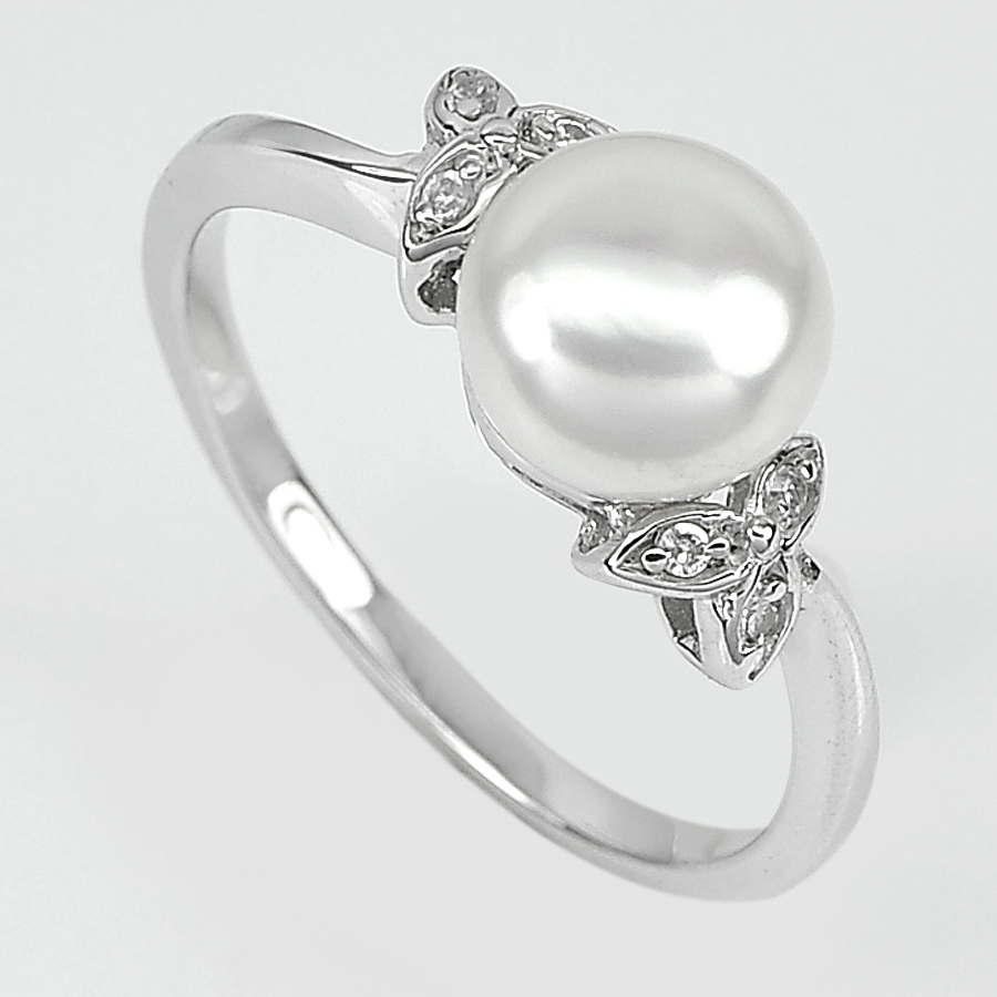 3.23 G. Round Cabochon Natural White Pearl Real 925 Sterling Silver Ring Size 8