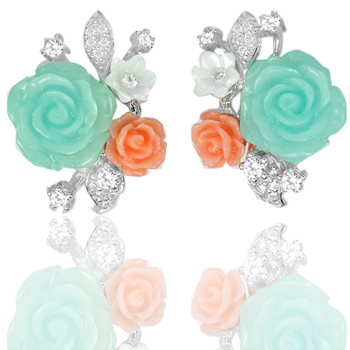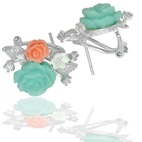 8.94 G. Rose Flower Green Orange Resin Real 925 Sterling Silver Earrings