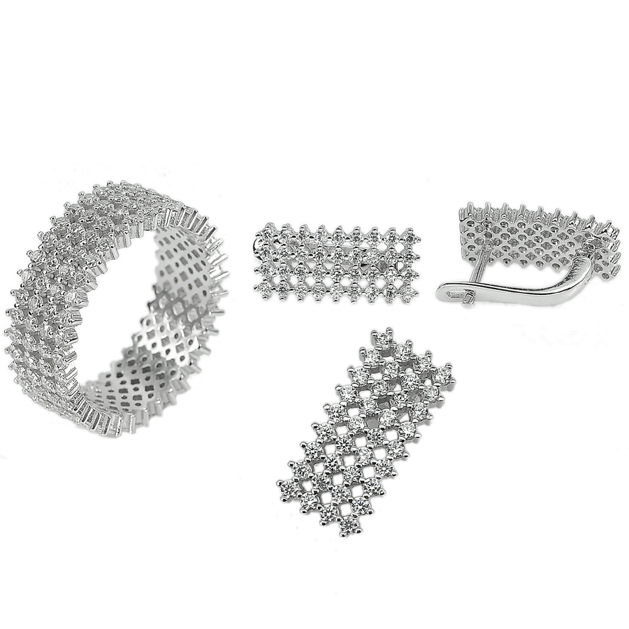 Round White CZ Size 1 x 1 Mm. Many. Pendant Size 16 x 7 Mm. Earrings Size 16 x 11 Mm. Ring Size 21 x 17 Mm.
