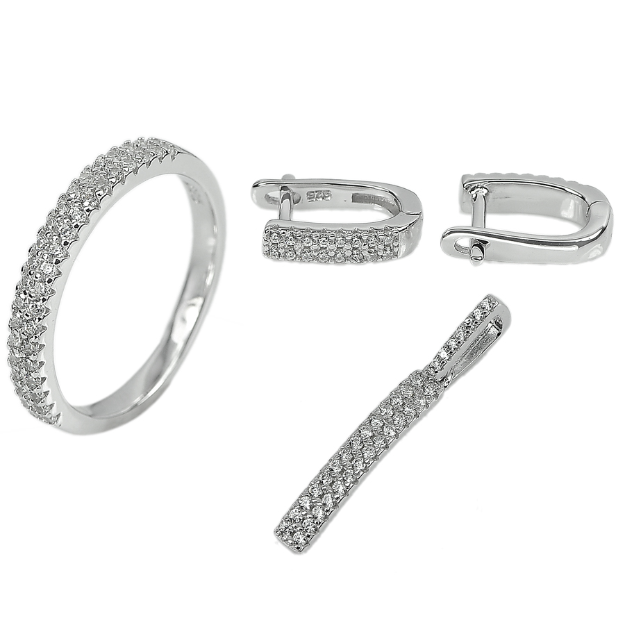 Round White CZ Size 1 x 1 Mm. Many. Pendant Size 29 x 3 Mm. Earrings Size 15 x 12 Mm. Ring Size 20 x 17 Mm.
