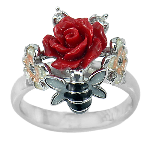 Round White CZ Size 1 x 1 Mm 4 Pcs. Red Rose Powder. Bee and Flower Enamel.