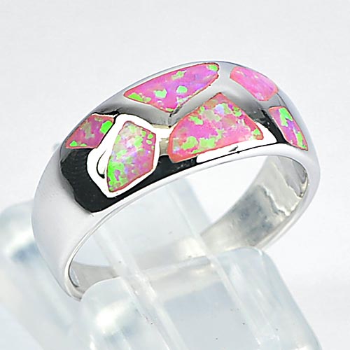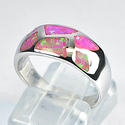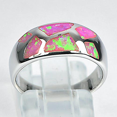 4.45 G. Pink Fire Created Opal Inlay 925 Sterling Silver Ring Size 7
