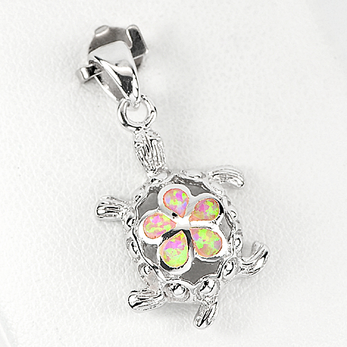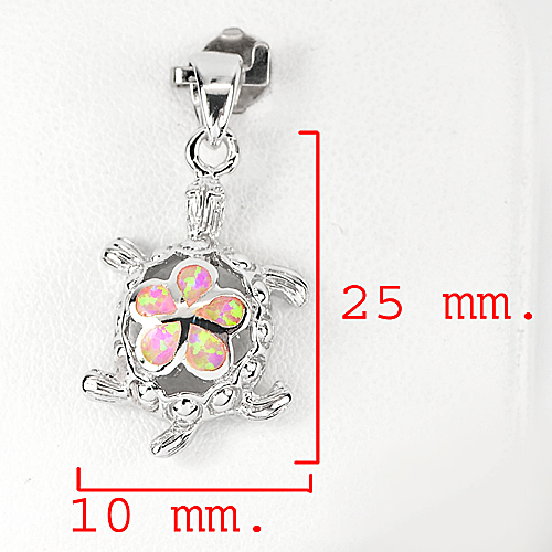 925 Sterling Silver Pendant Turtle with Created Multi Color Pink Opal 3.33 G.