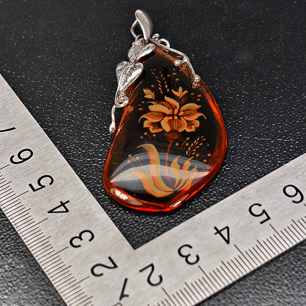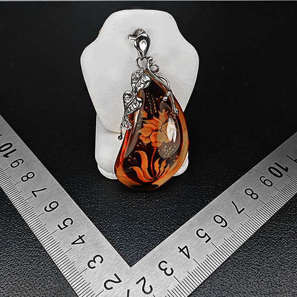 Natural Brown Yellow Amber Flower Carving In 925 Sterling Silver Jewelry 8.76 Grams Pendant