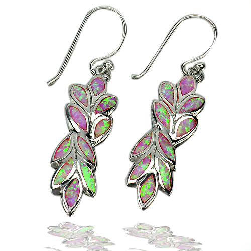 Created Multi Color Pink Opal Olive Leaf Design 925 Sterling Silver Earrings