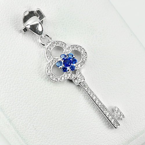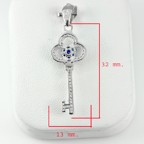 925 Sterling Silver Pendant Key And Flower Design Blue CZ