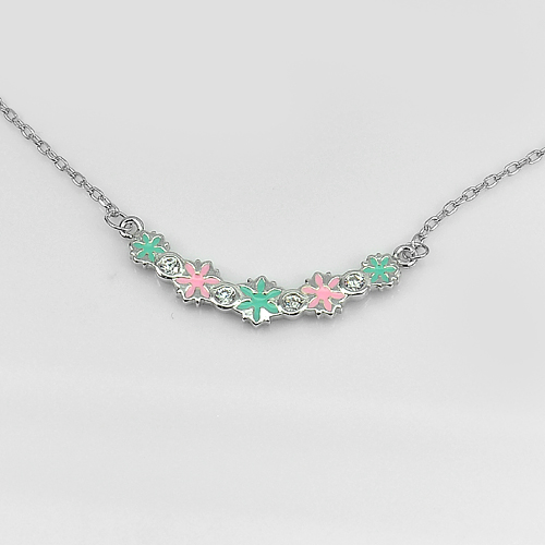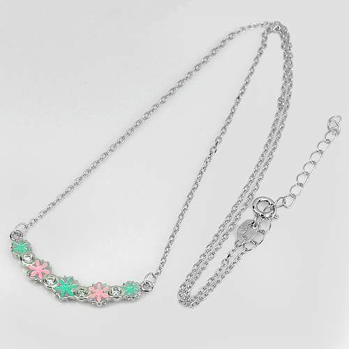Flower Pink And Green Enamel Design 925 Sterling Silver Necklace Length 14 Inch.