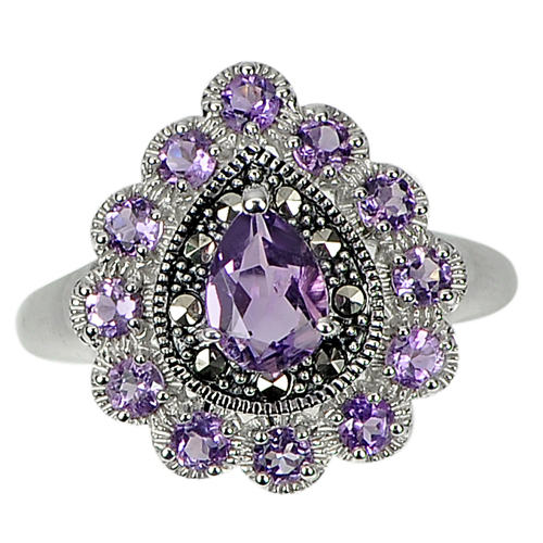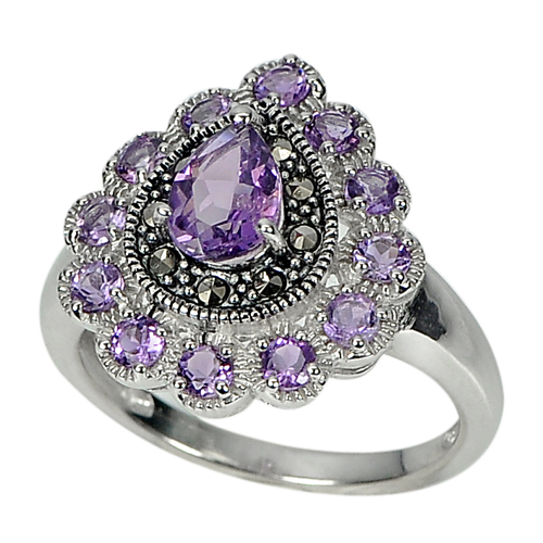 Natural Purple Amethyst Pear Size 7 x 5 Mm. 1 Pc. Natural Purple Amethyst Round Size 2.5 x 2.5 Mm. 12 Pcs. And Marcasite Round Size 1 x 1 Mm. 9 Pcs. Stam 925