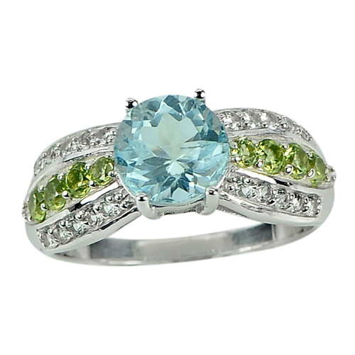 Center: Natural Swiss Blue Topaz Round Size 8 x 8 Mm. Natural Green Peridot Round Size 2 x 2 Mm. 8 Pcs. And White CZ Round Size 1 x 1 Mm. 20 Pcs.