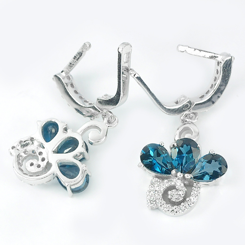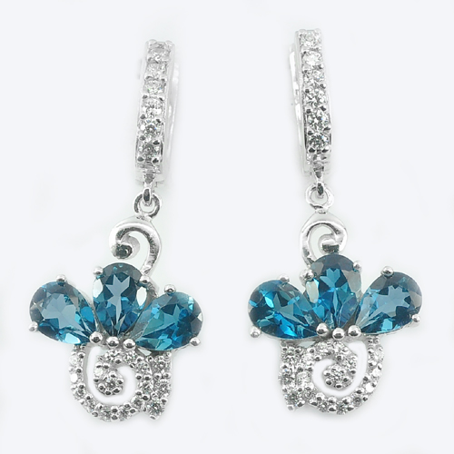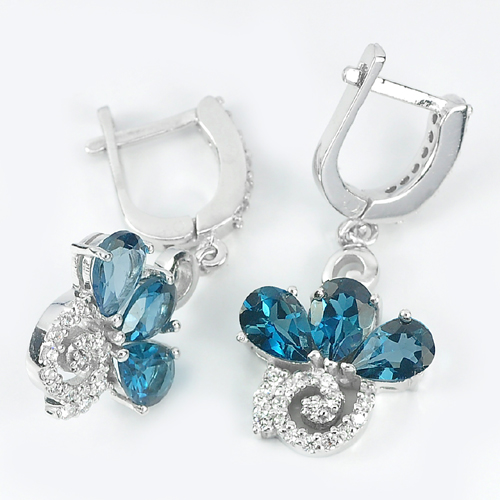 925 Sterling Silver Earrings 7.63 G. Natural Gem Pear Shape London Blue Topaz