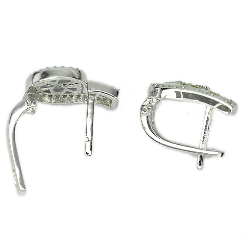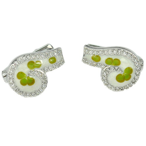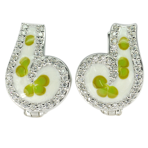 5.62 G. Flower Green Enamel with White CZ Real 925 Sterling Silver Earrings