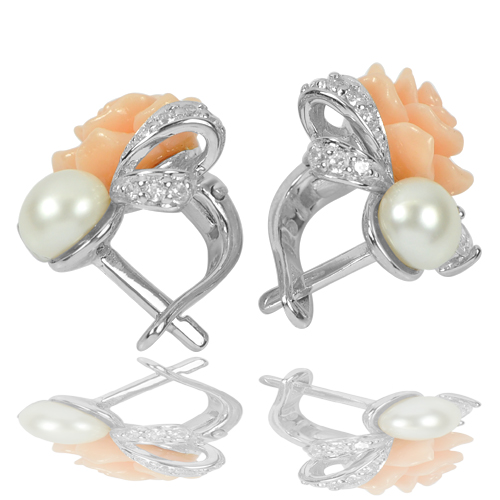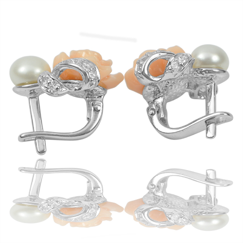5.12 G. Natural Pearl and Orange Rose Resin Real 925 Sterling Silver Earrings