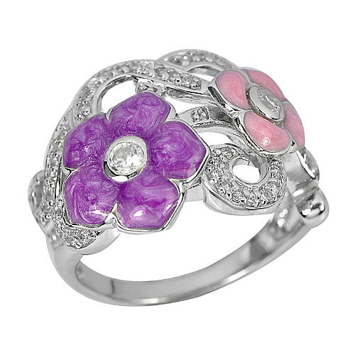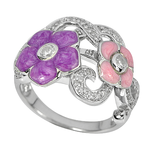 5.99 G. Flower Enamel With White CZ Real 925 Sterling Silver Ring Size 8