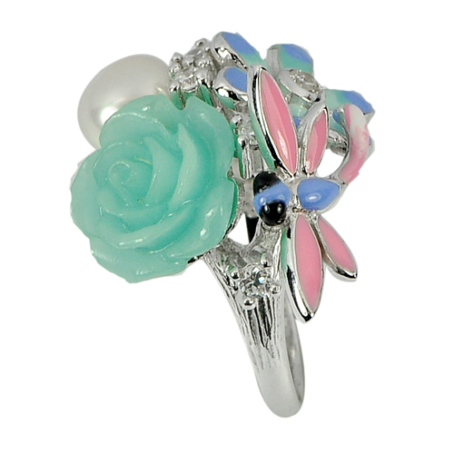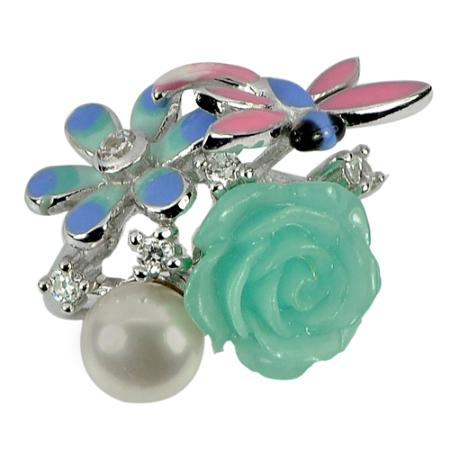 Center: Green Rose Resin ,Natual White Pearl Round Size 7.1 x 7.1 Mm. And White CZ Round Size 2 x 2 Mm.