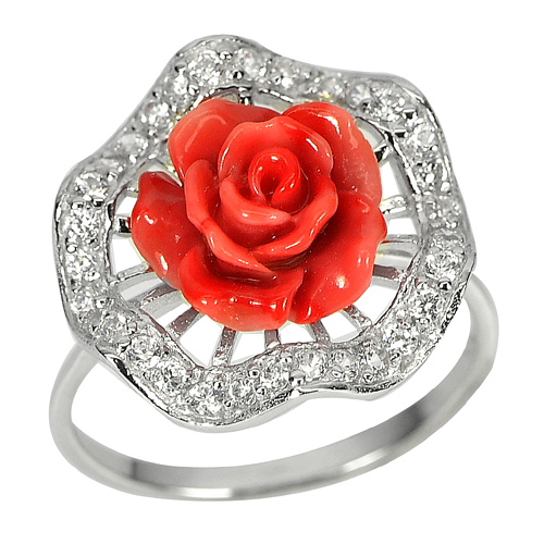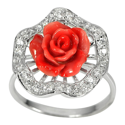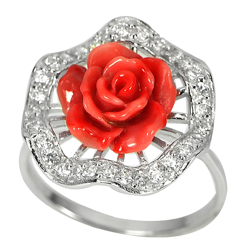 3.33 Gram. Orange Rose Resin with White CZ Real 925 Sterling Silver Ring Size 8