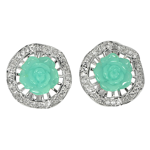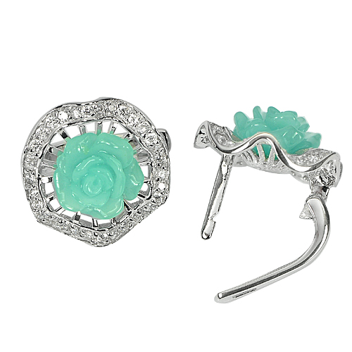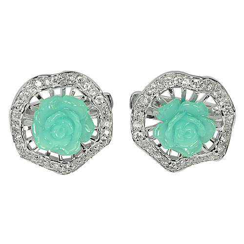 925 Sterling Silver Earrings 6.72 G. Green Rose Flower Resin with White CZ