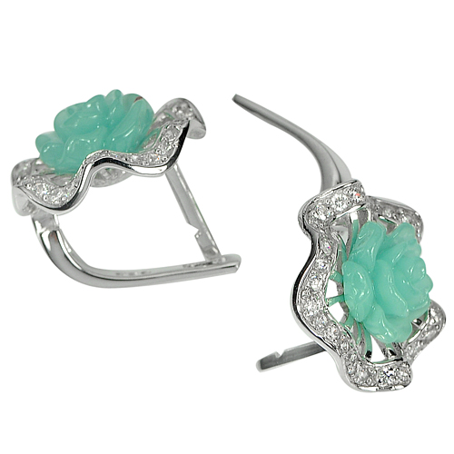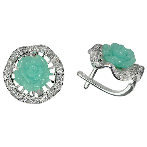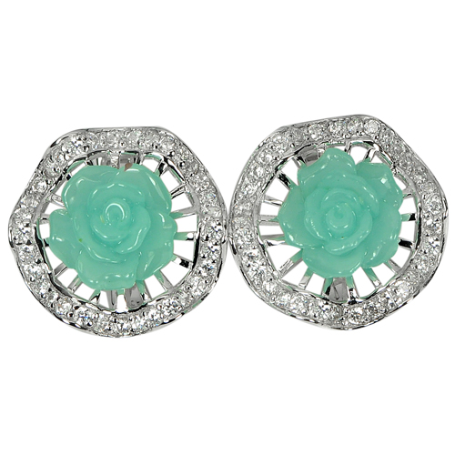 6.76 G. Green Rose Resin and Round White CZ Real 925 Sterling Silver Earrings