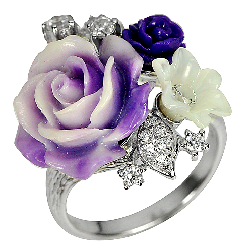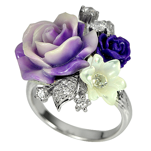 Purple Flower Carving Resin Size 6 Mm. and 15 Mm. White Flower Shell Pearl Size 10 x 10 Mm. And White CZ Round Size 1.5 to 2.5 Mm.