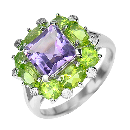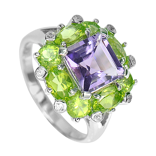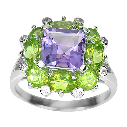 6.05 G. Natural Amethyst Peridot Gemstone Real 925 Sterling Silver Ring Size 8