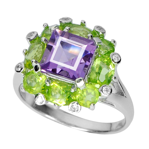 Natural Purple Amethyst Square Size 8 x 8 Mm. Natural Green Peridot Oval Size 6 x 4 Mm. 4 Pcs. Natural Green Peridot Round Size 4 x 4 Mm. 4 Pcs. And White CZ Round Size 1 x 1 Mm. 8 Pcs.