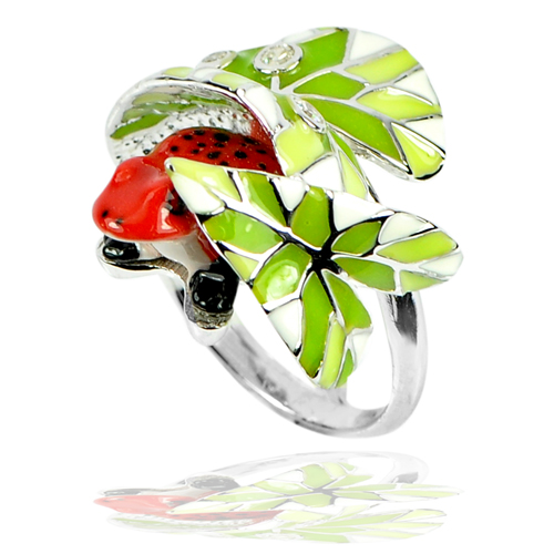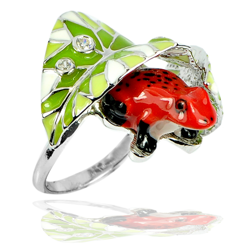 9.12 G. Red Frog Enamel Design Round White CZ 925 Sterling Silver Ring Size 8