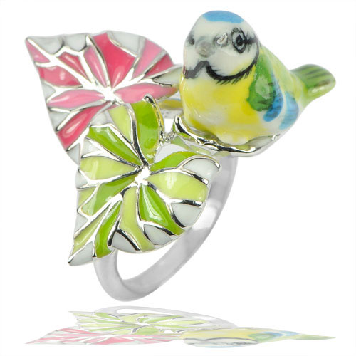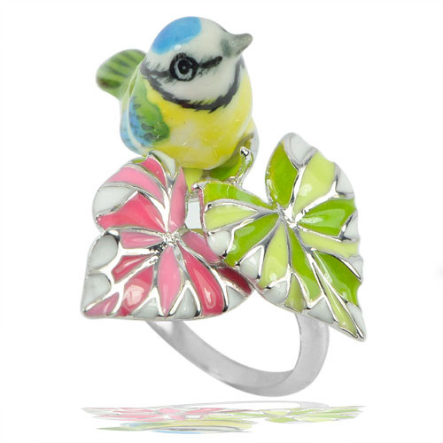 925 Sterling Silver Ring Jewelry Lovely Bird and Leaf Enamel Design Size 7
