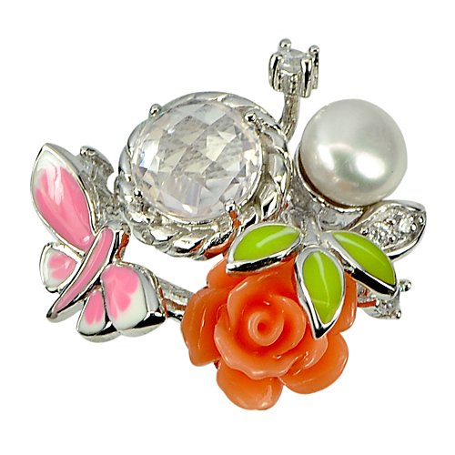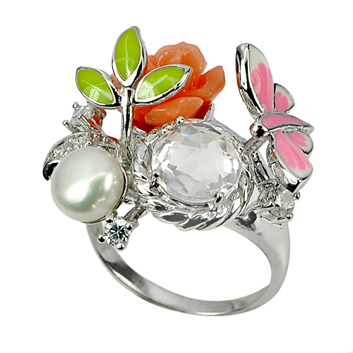 7.70 G. Natural Quartz and White Pearl Real 925 Sterling Silver Ring Size 7