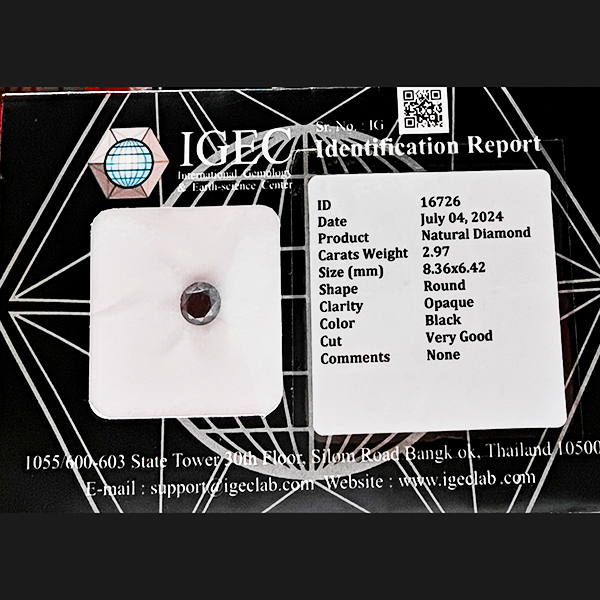 Natural Black Diamond 2.97 Ct. Round Brilliant Cut 8.36 x 6.42 Mm. From Belgium