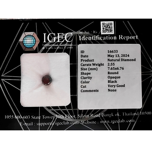 Certified Natural Black Diamond 2.55 Ct. Round Brilliant Cut 7.65 x 6.76 Mm