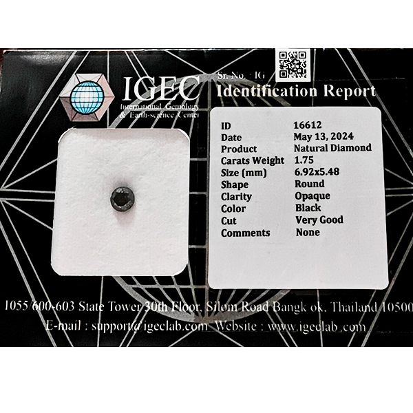Certified Natural Black Diamond 1.75 Ct. Round Brilliant Cut 6.92 x 5.48 Mm