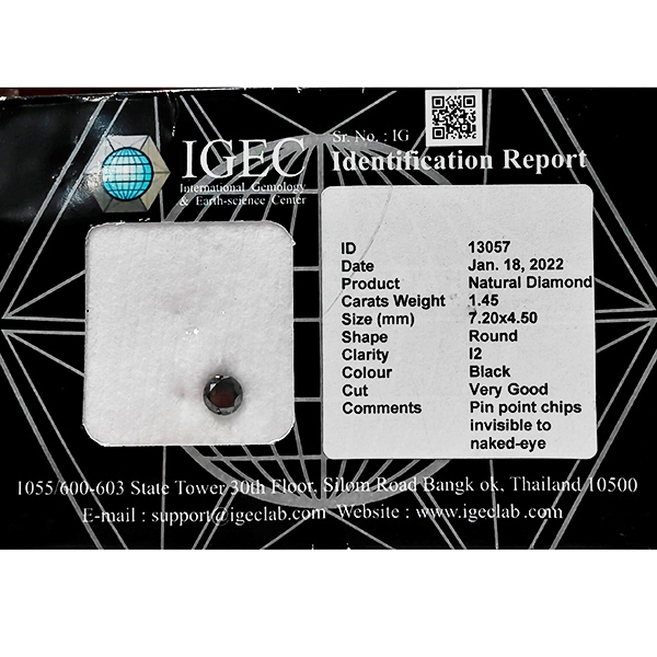 Certified Natural Black Diamond 1.45 Ct. Round Brilliant Cut 7.20 x 4.50 Mm