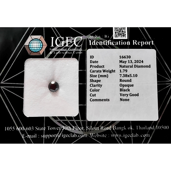Certified Natural Black Diamond 1.79 Ct. Round Brilliant Cut 7.38 x 5.10 Mm
