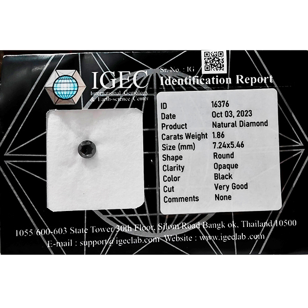 Certified Natural Black Diamond 1.86 Ct. Round Brilliant Cut 7.24 x 5.46 Mm