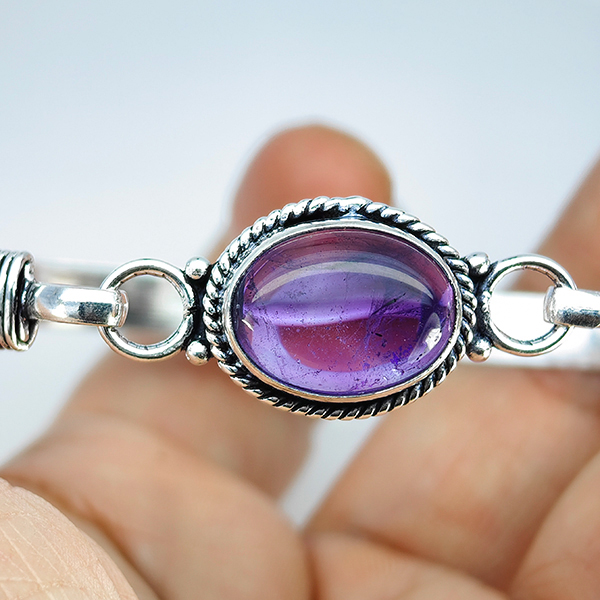 Natural Gemstone Oval Cabochon Shape 14.94 Grams Metal Silver Plated Fine Jewelry Bangle 7 Inch