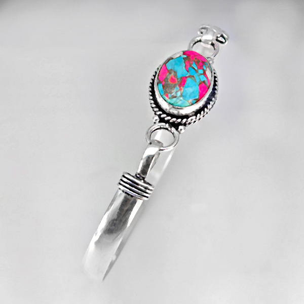 Natural Gemstone Oval Cabochon Shape 14.94 Grams Metal Silver Plated Fine Jewelry Bangle 7 Inch