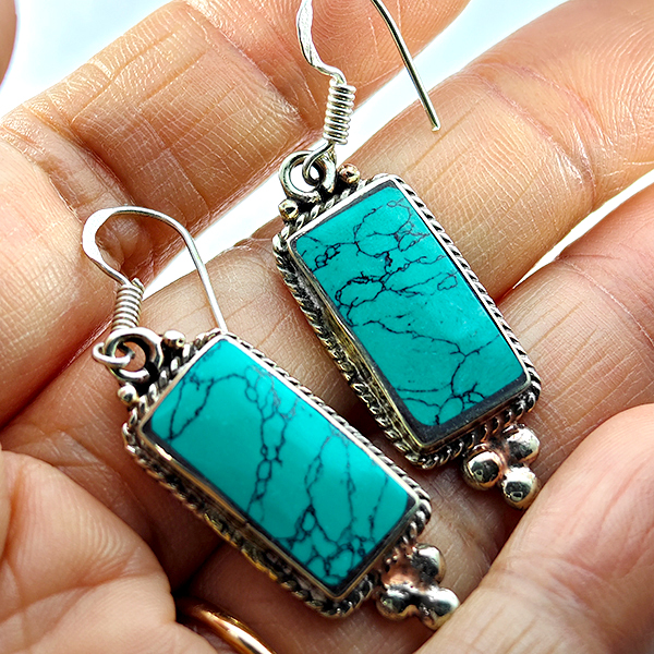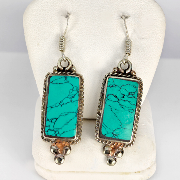 Natural Gemstone Baguette Cabochon Shape Metal Silver Plated Fine Jewelry Earrings 9.52 Grams