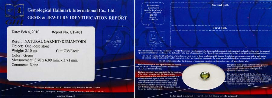 Certified Demantoid Garnet 2.10 Ct. Clean Oval 8.70 x 6.89 Mm. Natural Gemstone