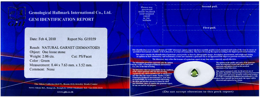 Certified Green Demantoid Garnet 2.06 Ct. VVS Pear 8.44 x 7.63 Mm. Natural Gem