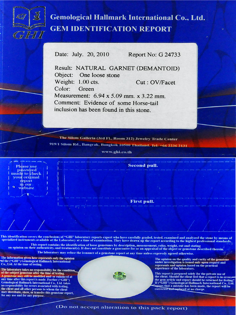 Certified Green Demantoid Garnet 1.00 Ct. Oval 6.94 x 5.09 Mm. Natural Gemstone